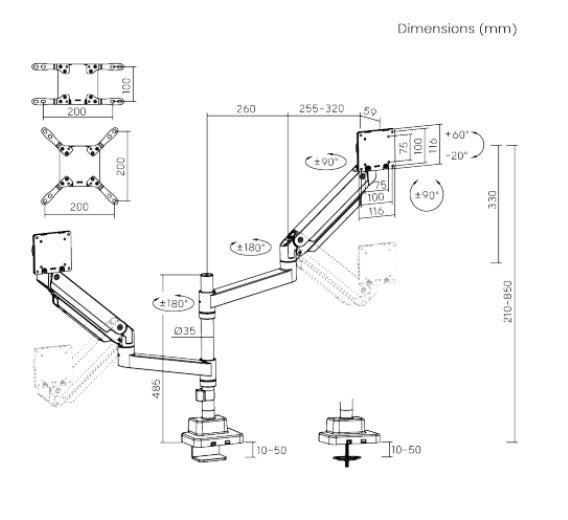 Suggested Desktop Thickness: Clamp:10~50mm Grommet:10~50mm (Clamp:0.39'~2' Grommet:0.39'~2')