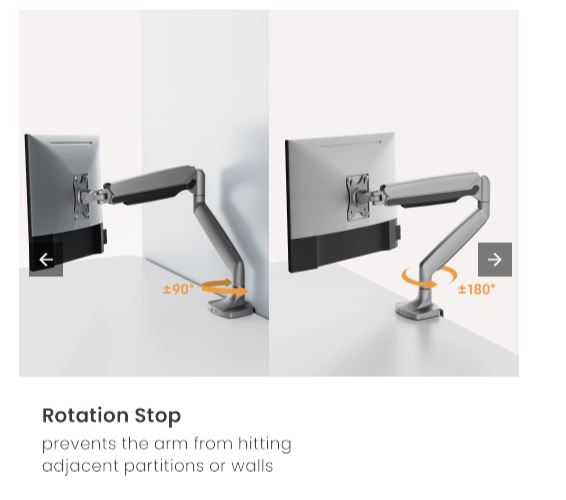 â—180° Rotation Stop: prevents monitor arm from swinging into screens or walls