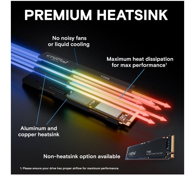 Crucial T705 2TB Gen5 NVMe SSD Heatsink - 14500/12700 MB/s R/W 1200TBW 1550K IOP