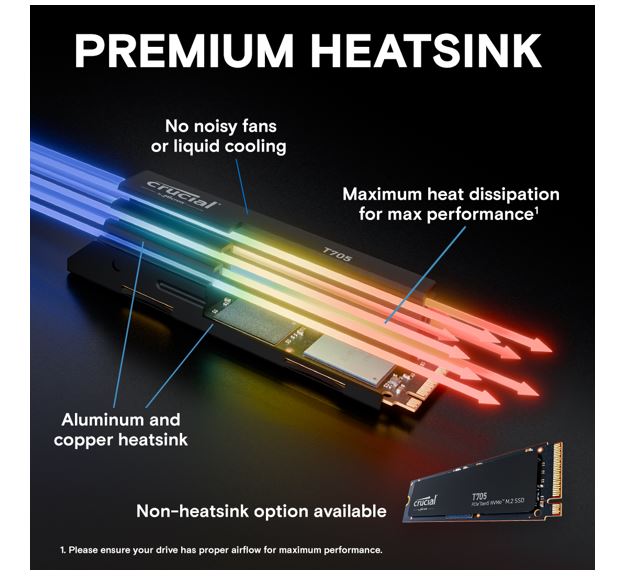 Crucial T705 4TB Gen5 NVMe SSD Heatsink - 14100/12600 MB/s R/W 2400TBW 1500K IOP