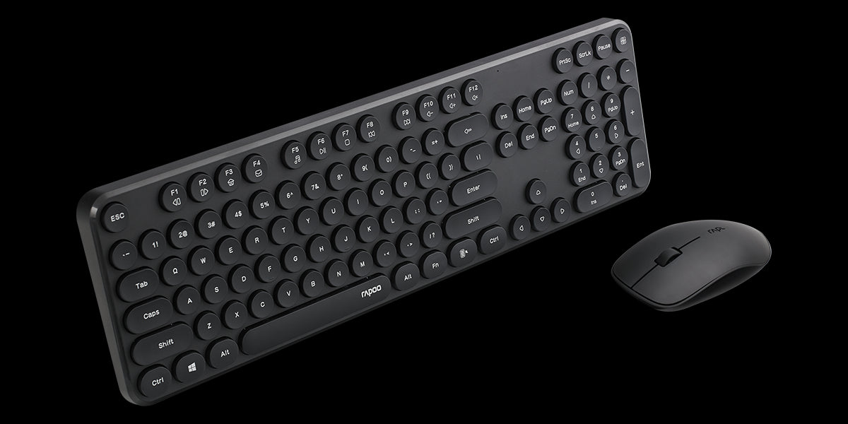 RAPOO Wireless Optical Mouse & Keyboard Black - 2.4G Connection, 10M Range, Spill-Resistant, Retro Style Round Key Cap, 1000DPI - Black